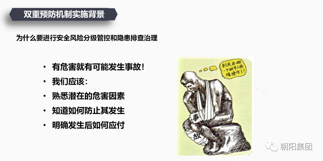 在培訓(xùn)活動(dòng)中,朝陽集團(tuán)申總詳細(xì)給員工講解了風(fēng)險(xiǎn)分級(jí)管控、隱患排查治理的概念、方法和流程等,并強(qiáng)調(diào)了雙重預(yù)防機(jī)制在安全生產(chǎn)中的重要性。申總首先對(duì)雙重預(yù)防機(jī)制的定義進(jìn)行了闡述,再對(duì)風(fēng)險(xiǎn)分級(jí)管控與隱患排查治理的雙重預(yù)防機(jī)制進(jìn)行了深入的講解。